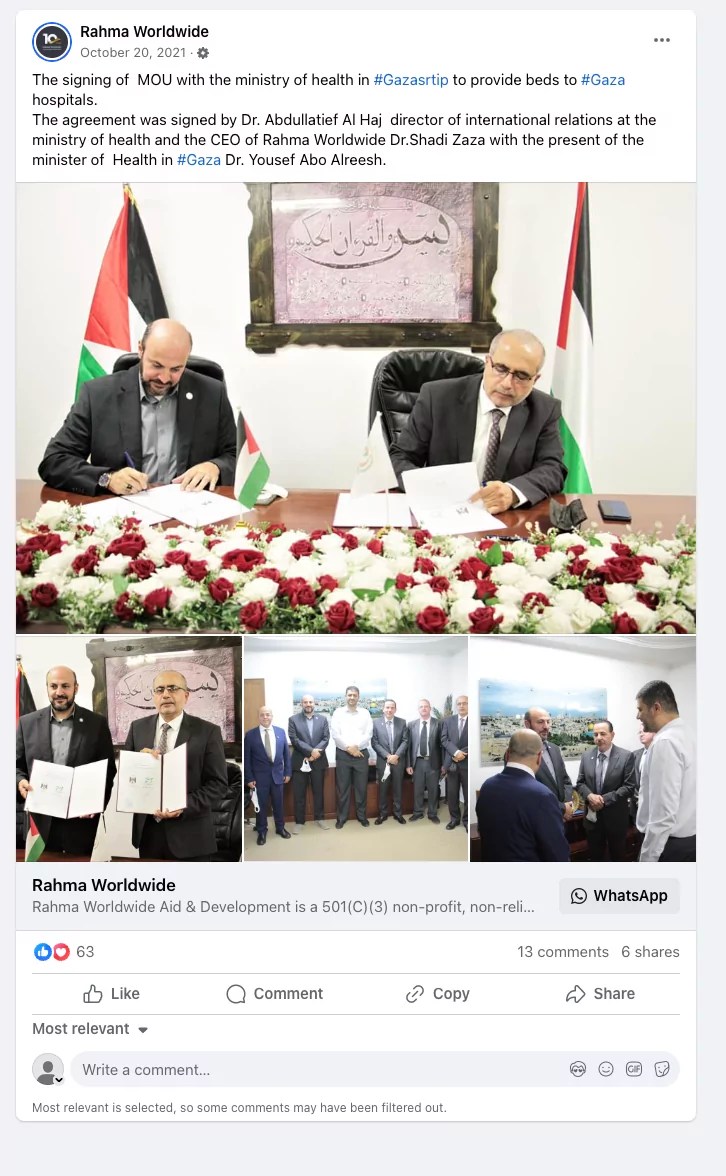Just last year, Rahma Worldwide organized an event with Mohamad Rateb al Nabulsi, a Syrian cleric who has appeared on al Aqsa TV, the official network of Hamas, to call for the killing of gay people, the New York Post reported. In October 2021, Rahma Worldwide shared a post on Facebook depicting Rahma Worldwide’s Shadi Zaza signing an agreement with officials at the Hamas-run health ministry in Gaza.