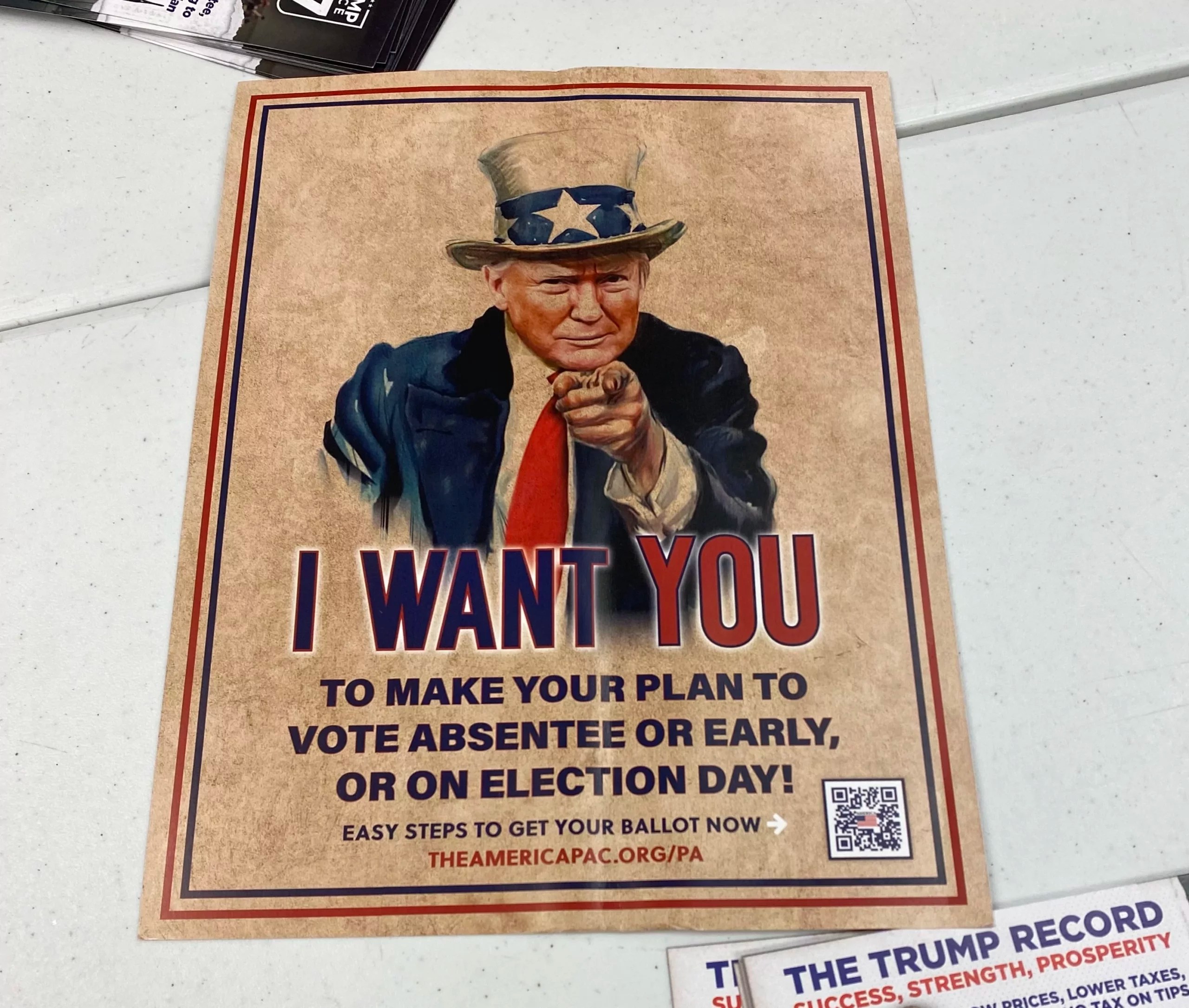 In Pittsburgh, Trump Force 47 volunteers passed out America PAC fliers that also pushed voters to create a plan to vote in the election. The flier featured an illustration of Trump appearing as Uncle Sam with the caption: “I want you to make your plan to vote absentee or early, or on Election Day!”