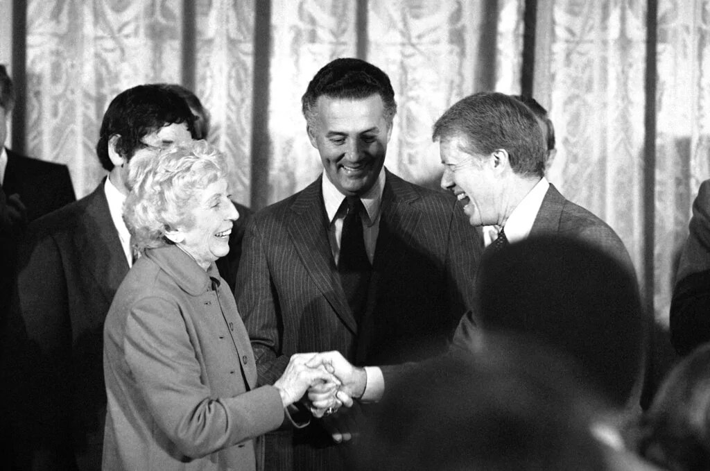 Former President Jimmy Carter gets his bars pinned on by his wife, Rosalynn Carter, left, and his mother, Lillian Carter, at the U.S. Naval Academy in this undated photo. (AP Photo)Former President Jimmy Carter, then-Georgia governor, holds his daughter, Amy Carter, 7, just after he made an announcement in Atlanta that he would seek the Democratic nomination for the presidency, Dec. 13, 1974. Earlier, Jimmy Carter had told the National Press Club in Washington, D.C., that he planned to enter primaries in New Hampshire, Florida, Wisconsin, Indiana, Alabama, New York, and California. (AP Photo)Former President Jimmy Carter, then-presidential candidate, center, reaches out to shake the hand of an unidentified Allis Chalmers factory worker outside a plant’s gates in suburban West Allis, Sept. 10, 1976, Milwaukee, Wisconsin. Chanting anti-abortion demonstrators hold up their signs in the background. The rest of the group is unidentified. (AP Photo/Paul Shane)Former President Jimmy Carter and first lady Rosalynn Carter walk down Pennsylvania Avenue after Jimmy Carter was sworn in as the nation’s 39th president, Jan. 20, 1977, Washington, D.C. (AP Photo)Former President Jimmy Carter embraces former Vice President Walter Mondale on the South Lawn of the White House in Washington, D.C., Jan. 7, 1978, after Carter returned from a nine-day overseas trip. (AP Photo/John Duricka, File)Former President Jimmy Carter shakes hands with Sen. Muriel Humphrey (D-MN) at the White House in Washington, D.C., Oct. 27, 1978, just before Carter signed the Humphrey-Hawkins full-employment bill into law. Looking on at the center is Sen. Paul Sarbanes (D-MD). (AP Photo)Former President Jimmy Carter and former Japanese Prime Minister Masayoshi Ohira begin their second round of talks at the Yoshida Villa on Tuesday, June 26, 1979, in Oiso, Japan. At left is former Secretary of State Cyrus Vance. (AP Photo)Former President Jimmy Carter uses a Native American quill pen to sign H.R.7919, the Maine Indian Claims Settlement Act of 1980, at a ceremony at the White House on Friday, Oct. 10, 1980. Shown in the photo, from left, are former Gov. Joseph Brennan (D-ME), former Secretary of State Edmund Muskie, former Secretary of the Interior Cecil Andrus, former Sen. George Mitchell (D-ME), and Terrance Polchies. (AP Photo/Barry Thumma)Former President Jimmy Carter, left, meets with Pope Shenuda III, leader of Egypt’s 6 million Coptic Christians, for a half-hour conversation, Saturday, March 21, 1987, in Cairo, Egypt. The former president was to leave later on Saturday for Damascus, Syria, the third stop on a five-nation Middle Eastern and North African tour. (AP Photo/Paola Crociani)Former President Jimmy Carter outlines a proposed peace agreement in the Bosnian Presidency building in Sarajevo, Dec. 20, 1994. Former Bosnian President Alija Izetbegovic said his government would accept an immediate four-month ceasefire. Carter headed back to Bosnian Serb headquarters in Pale to continue the negotiations. (AP Photo/Degi Delic)Former Palestine Liberation Organization Chairman Yasser Arafat gestures as he answers questions with former President Jimmy Carter after their meeting in Gaza City, Gaza Strip, Sunday, Jan. 21, 1996. With 60% of the ballots counted early morning, Arafat won 85% of the vote for the presidency.(AP PHOTO/Laurent Rebours)In this Friday, Oct. 22, 2010, file photo, former president of Ireland, Mary Robinson, background right, looks at former President Jimmy Carter, center, while visiting a weekly protest in the east Jerusalem neighborhood of Sheikh Jarrah. The protest was organized by groups supporting Palestinians evicted from their homes in east Jerusalem by Israeli authorities. On Wednesday, Aug. 12, 2015, Carter announced he had cancer and would undergo treatment at an Atlanta hospital. (AP Photo/Bernat Armangue)
