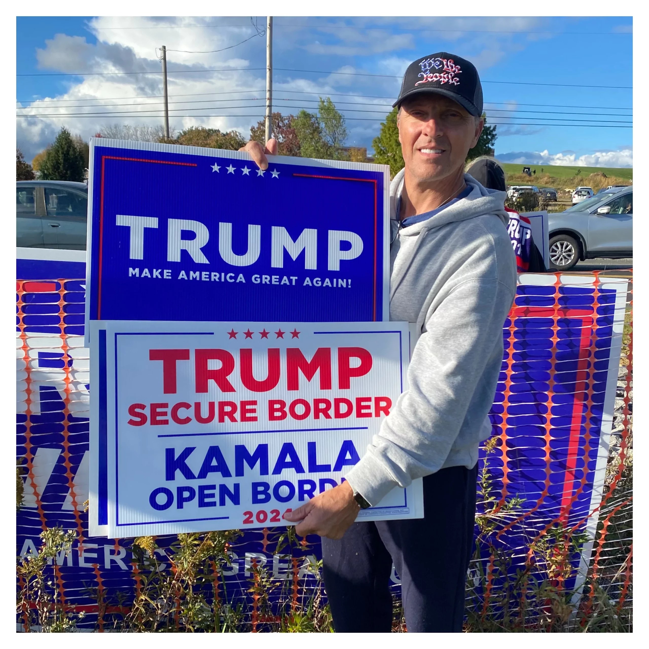 Ben Rathgen, 57, a retired law enforcement officer, protested while holding a sign saying, “Trump secure border, Kamala open border.”