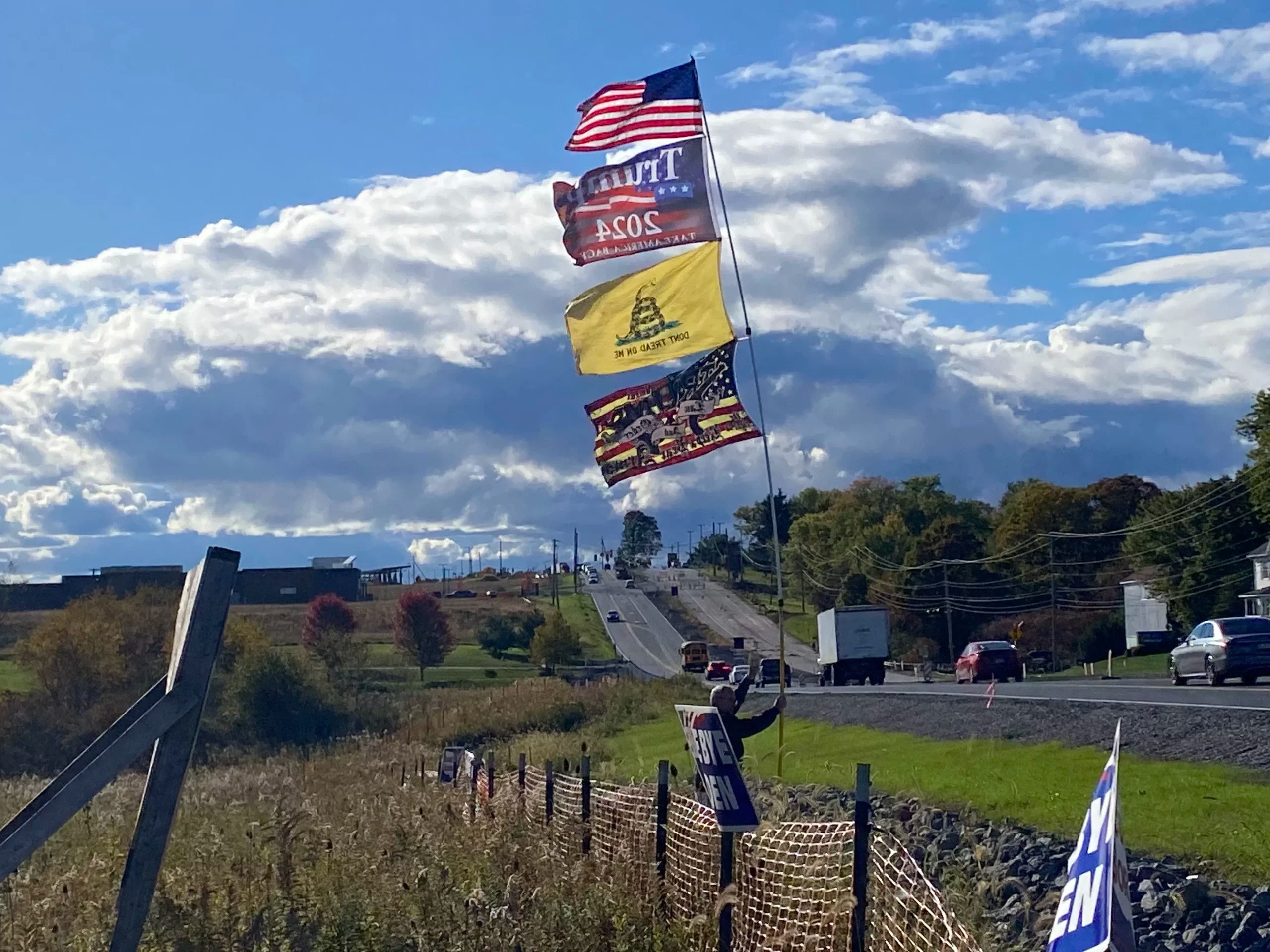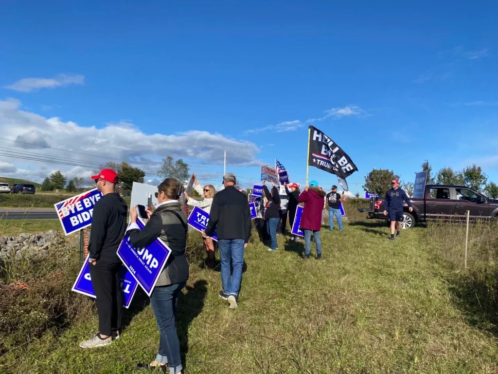 A Trump supporter protests the arrival of Gov. Tim Walz (D-MN) at Bloom Cafe in Butler County, Pennsylvania. (Courtesy of Carol Knox)