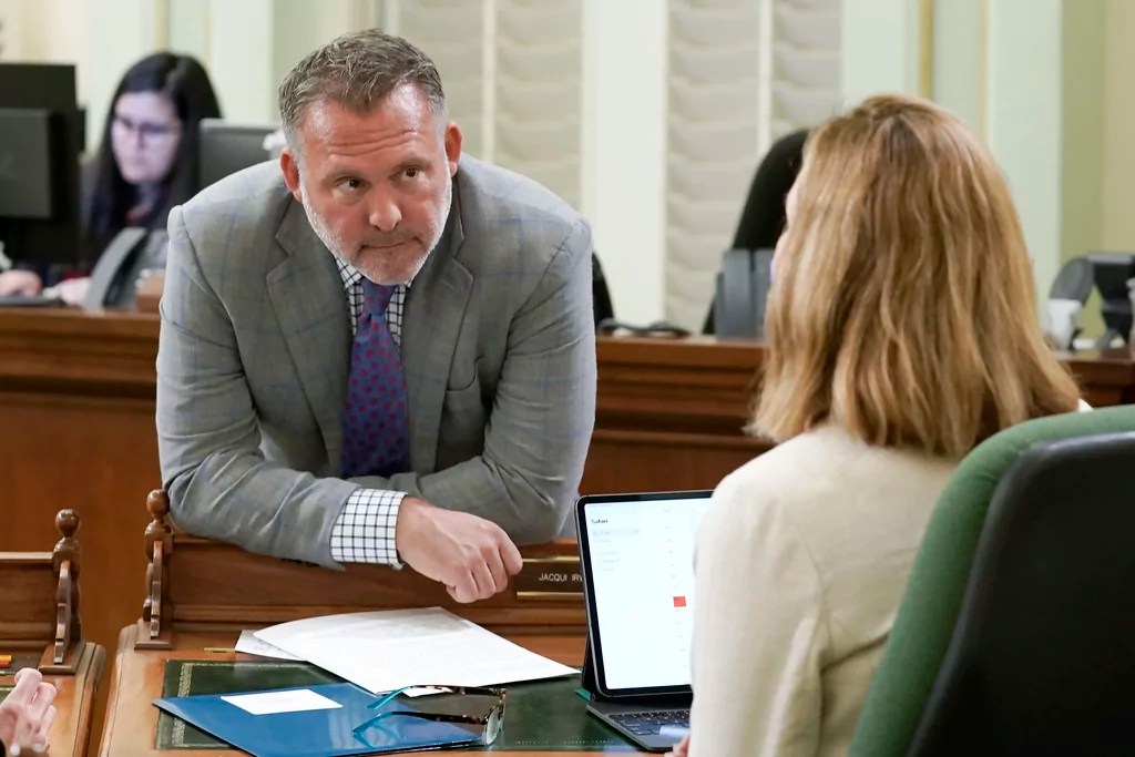Democratic Assembly members Adam Gray and Jacqui Irwin of Thousand Oaks discuss legislation at the Capitol in Sacramento, California, Wednesday, May 25, 2022. (AP Photo/Rich Pedroncelli, File)