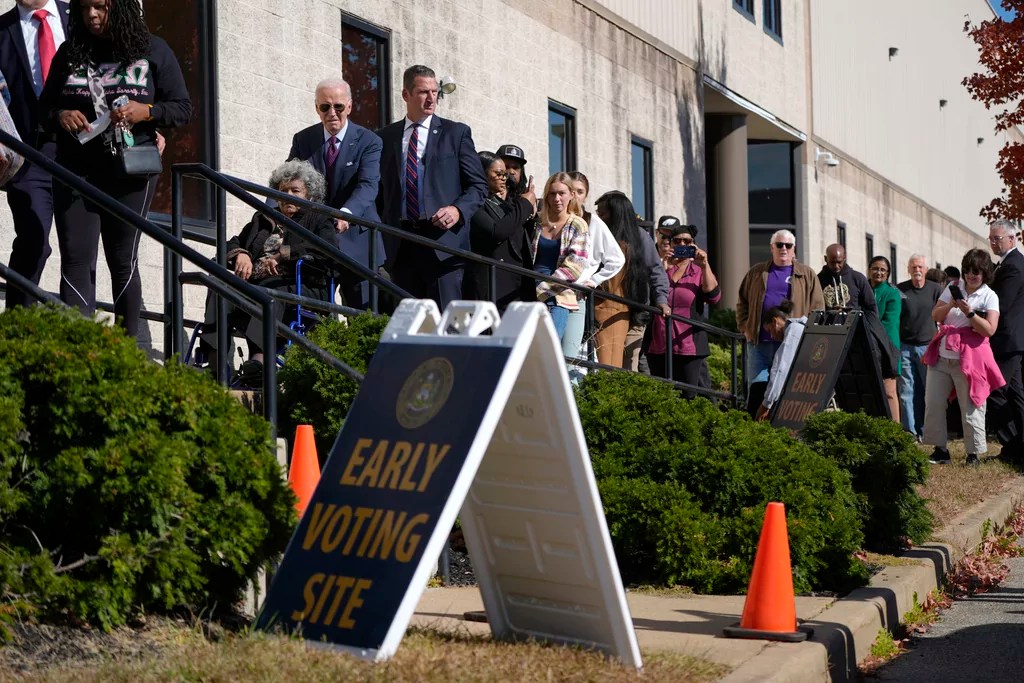 At an early voting center in New Castle, Delaware, Biden stood outside with a crowd of 2024 election voters, including one red-hatted supporter of former President Donald Trump.