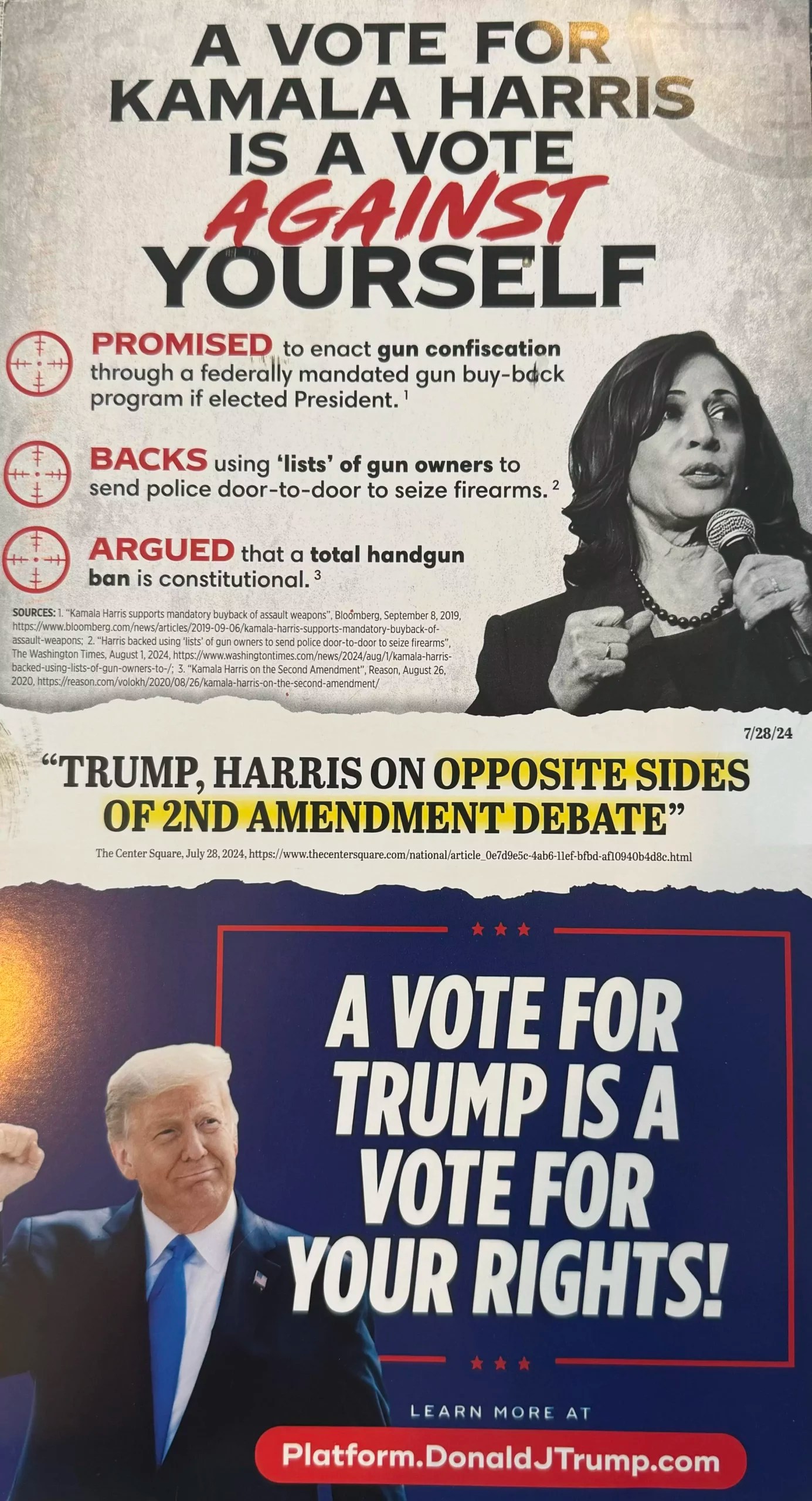 “Own a gun? Kamala Harris will take them or arrest you,” said one flier reviewed by the Washington Examiner. Another warned that “a vote for Kamala Harris is a vote against yourself.”