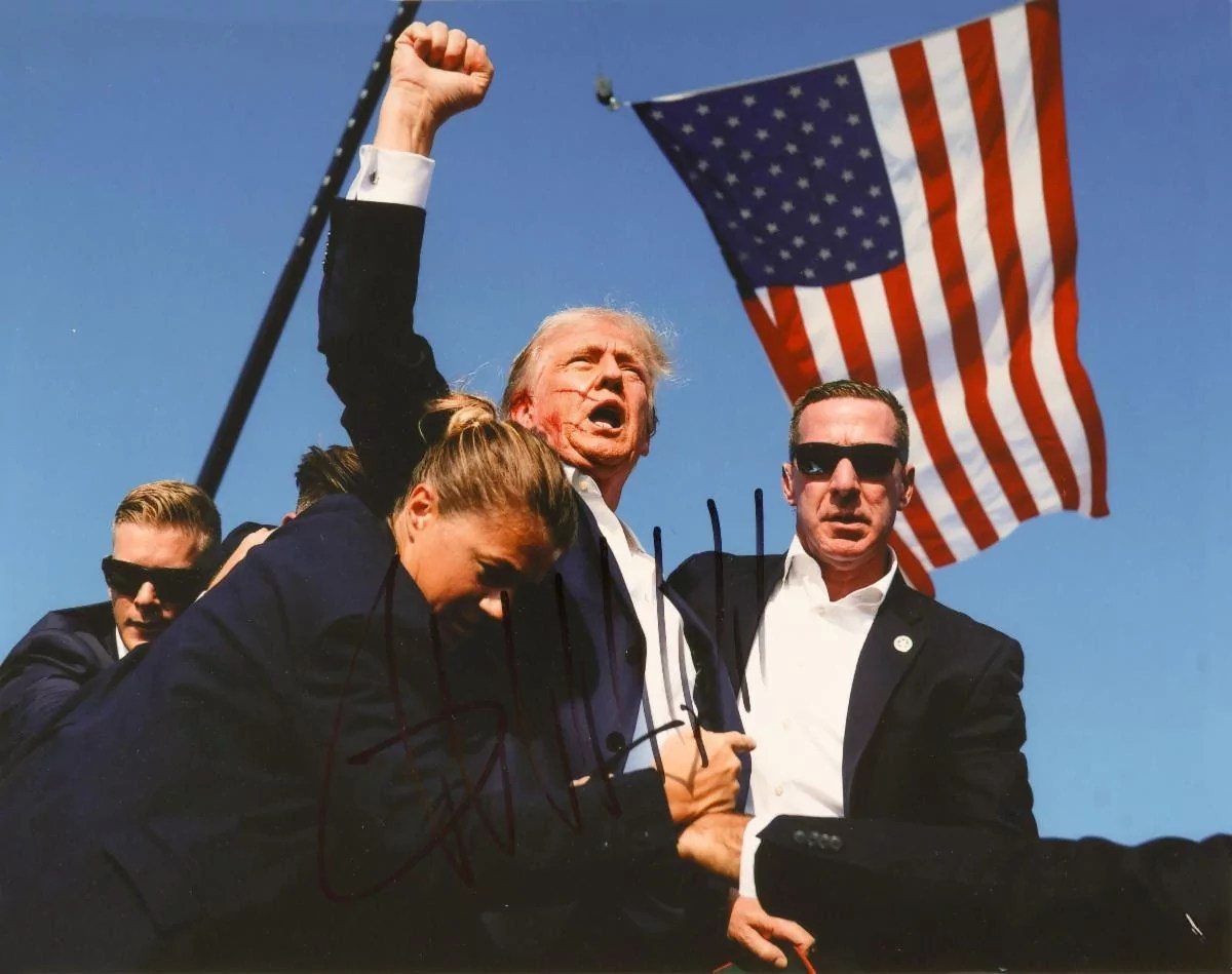 The other shows former President Donald Trump minutes after he was shot in Butler, Pennsylvania, last summer. It, too, is signed.
