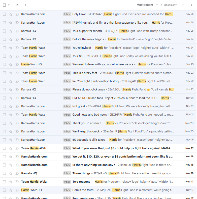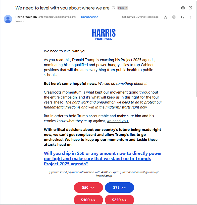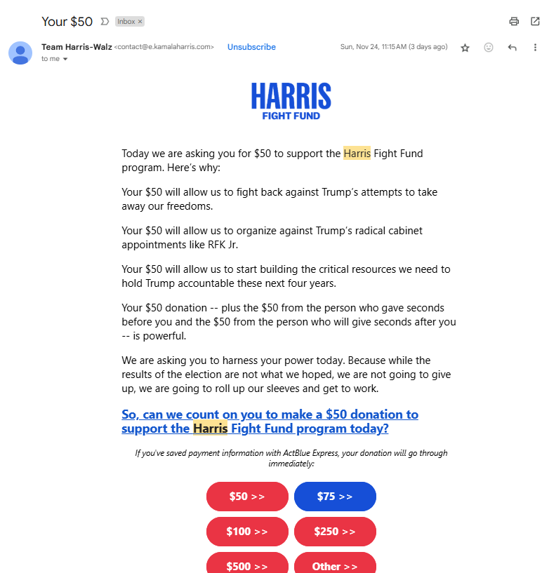 The people behind the emails appear somewhat self-aware, as one of the campaign’s post-election emails states, “You probably didn’t think you were going to end your day by giving a donation to support the Harris Fight Fund program.”