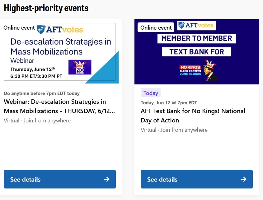 AFT, headed by noted labor activist Randi Weingarten, has a number of events slated to help train protesters ahead of Saturday. On Thursday night, for instance, the union is holding a webinar to teach demonstrators “de-escalation strategies and practical tools to handle challenges” to prepare them for “tough interactions with law enforcement [and] frustrated bystanders or counter-protesters.” Also on Thursday, the union is tapping its members to send out floods of text messages encouraging people to show up for the protests.