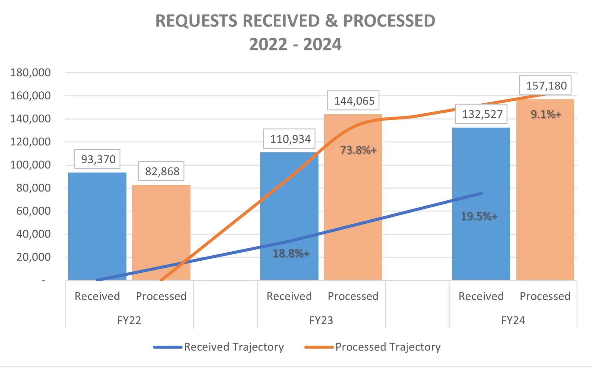 According to its 2025 Chief FOIA Officer Report, the department processed a record-breaking 157,180 requests in fiscal 2024, up from just 82,868 two years earlier, while reducing its backlog by more than 50%.