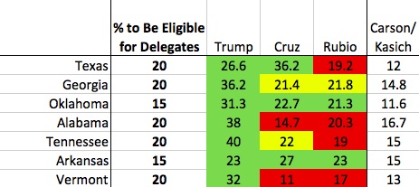 Although Georgia, Alabama, and Tennessee are each worth many fewer delegates than Texas, they’re worth more delegates (184) than Texas combined. Cruz and Rubio are in danger of falling short of the threshold in each of the three states. (It’s worth noting that party officials in each of these states tell THE WEEKLY STANDARD that the 20 percent floor is a hard number — not rounded up from, say, 19.5 percent.) It’s the same story in Vermont, but it’s worth only 16 total delegates.