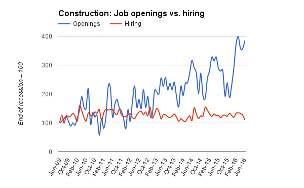 While construction job openings were up nearly 400 percent since the official end of the recession through June, actual hiring rose just 10 percent.