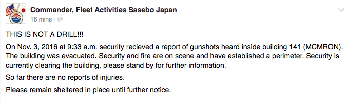 The commander of fleet activities posted an emergency message on Facebook around 10:30 p.m. EST warning those on base to take cover.