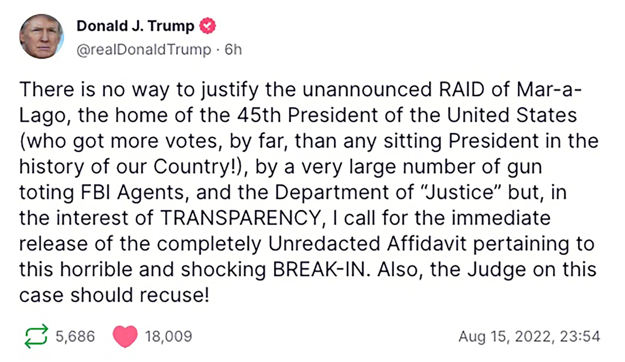 “There is no way to justify the unannounced RAID of Mar-a-Lago, the home of the 45th President of the United States (who got more votes, by far, than any sitting President in the history of our Country!), by a very large number of gun toting FBI Agents, and the Department of ‘Justice,'” Trump wrote on the platform late Monday. “But, in the interest of TRANSPARENCY, I call for the immediate release of the completely Unredacted Affidavit pertaining to this horrible and shocking BREAK-IN.”