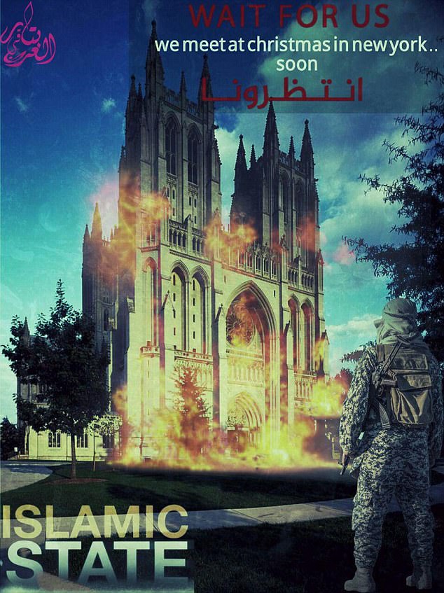 The propaganda ad states, “Wait for us. We meet at Christmas in New York… soon,” and shows the historic house of worship on fire.