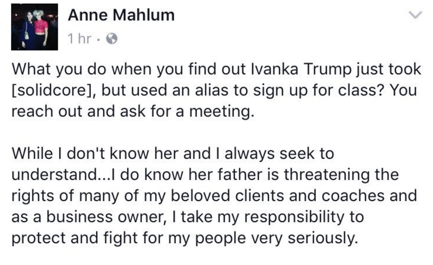 “What you do when you find out Ivanka Trump just took [Solidcore], but used an alias to sign up for class? You reach out and ask for a meeting,” wrote Anne Mahlum, founder of Solidcore.