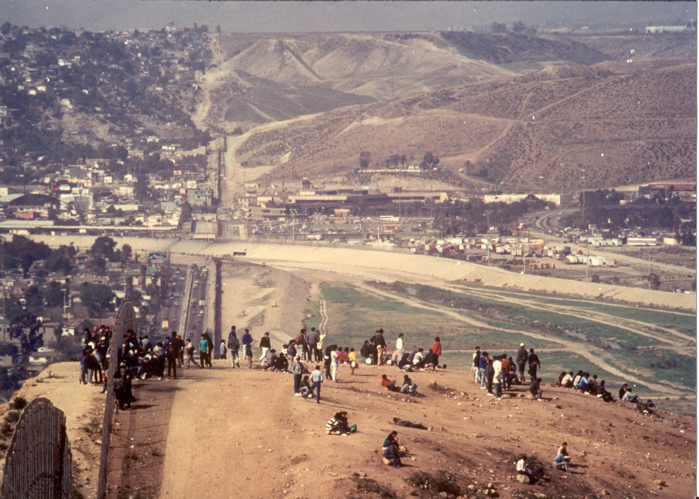 Dozens of illegal immigrants easily cross from Tijuana, Mexico into San Diego, Calif., through a single fence-like barrier in the 1980s. (Credit: U.S. Customs and Border Protection)