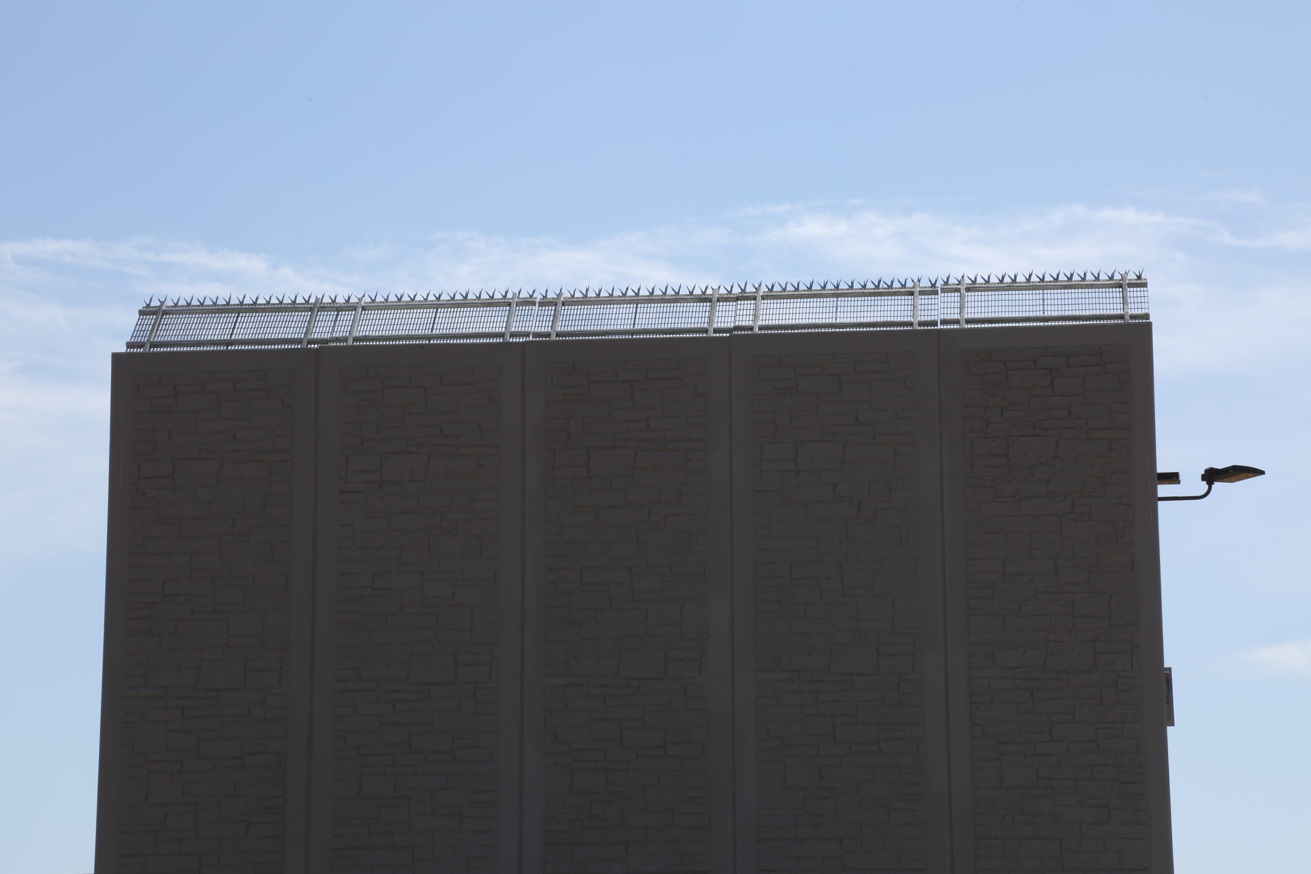 Texas Sterling Construction Co. has lined the top of its concrete prototype with steel mesh and impaling, anti-climb spikes. (Arik Dashevsky / Washington Examiner)