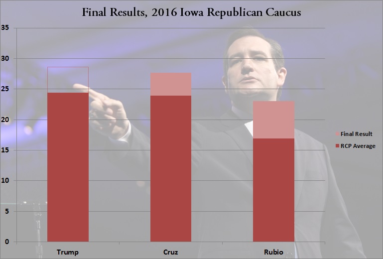 It turns out that Monday produced a similar surge — from two candidates. With 98 percent reporting, here is how the tallies for Cruz, Rubio and Trump stacked up against their final RealClearPolitics polling averages, with the difference noted in parentheses: