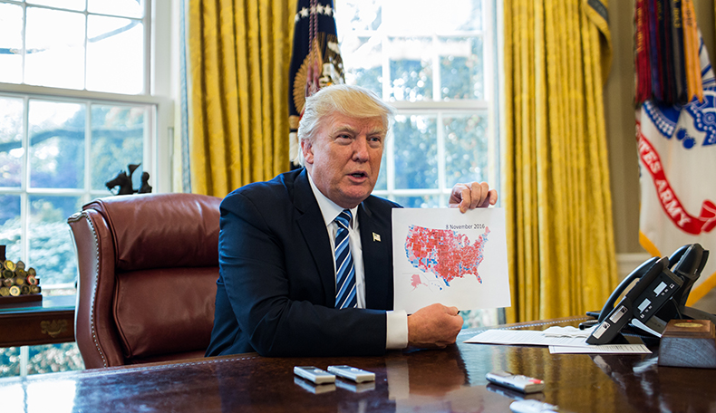 And with that, he reaches across the Resolute Desk for a sheet of paper showing a map of the United States. It illustrates the latest figures from the 2016 electoral map, and it is covered in a sea of red ink.