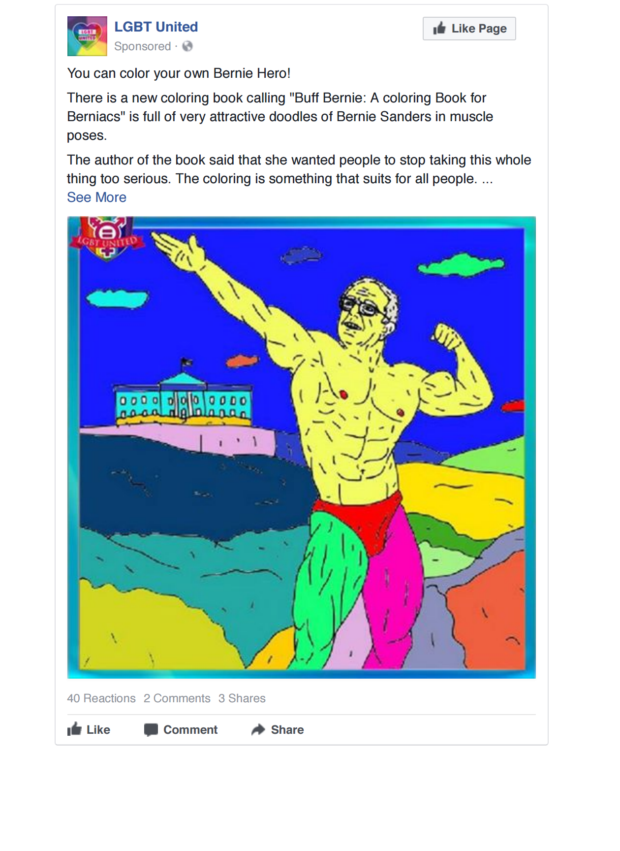 Another Facebook ad from a Russia-backed group called “LGBT United” shows Democratic presidential hopeful Bernie Sanders in a thong flexing outside of the White House, covered in rainbow colors with text showing a divide between Sanders and his rival for the nomination, Hillary Clinton.