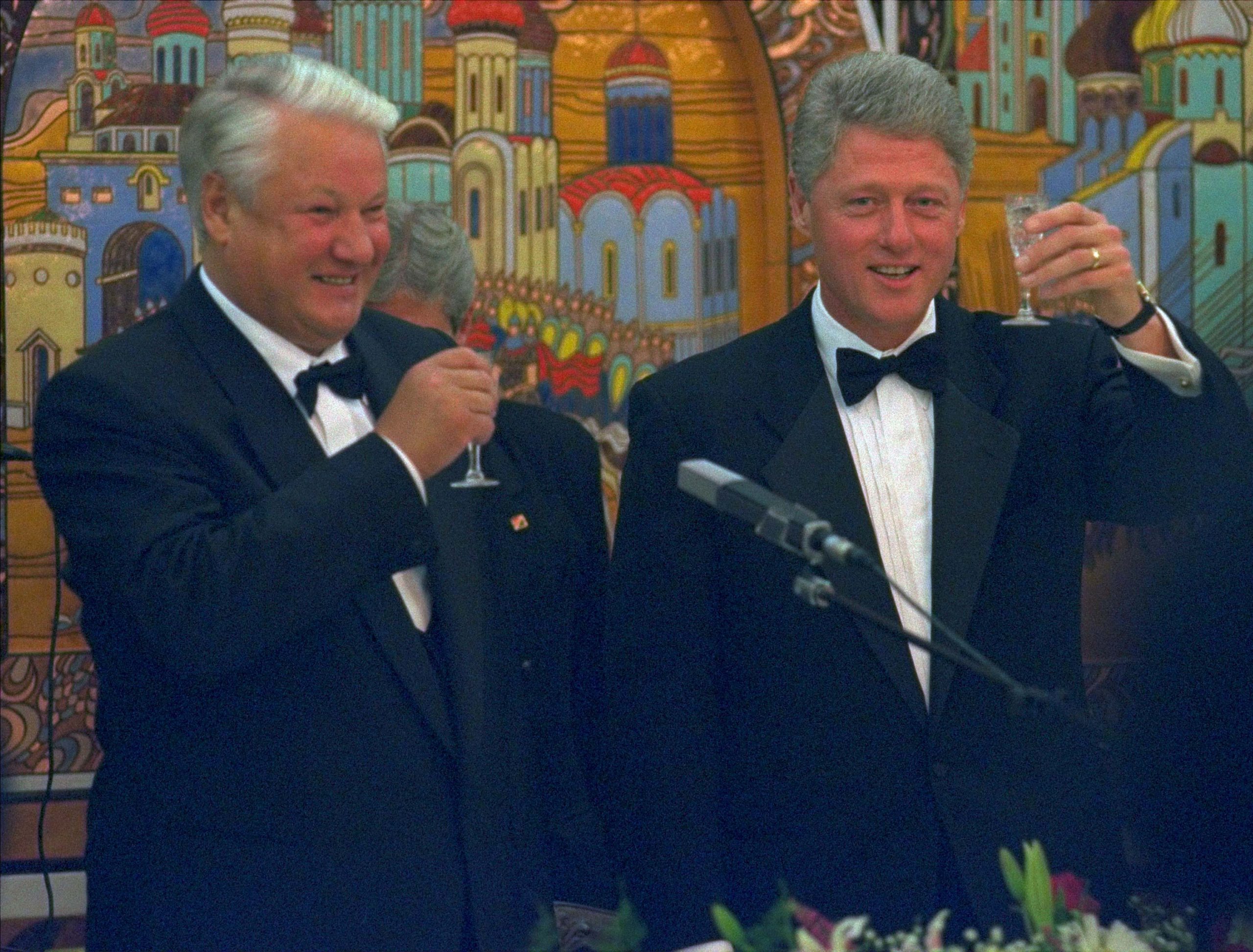 President Bill Clinton and Russian President Boris Yeltsin toast during a dinner at the Russian Embassy in Washington, Sept. 28, 1994. (AP Photo/Dennis Cook)
