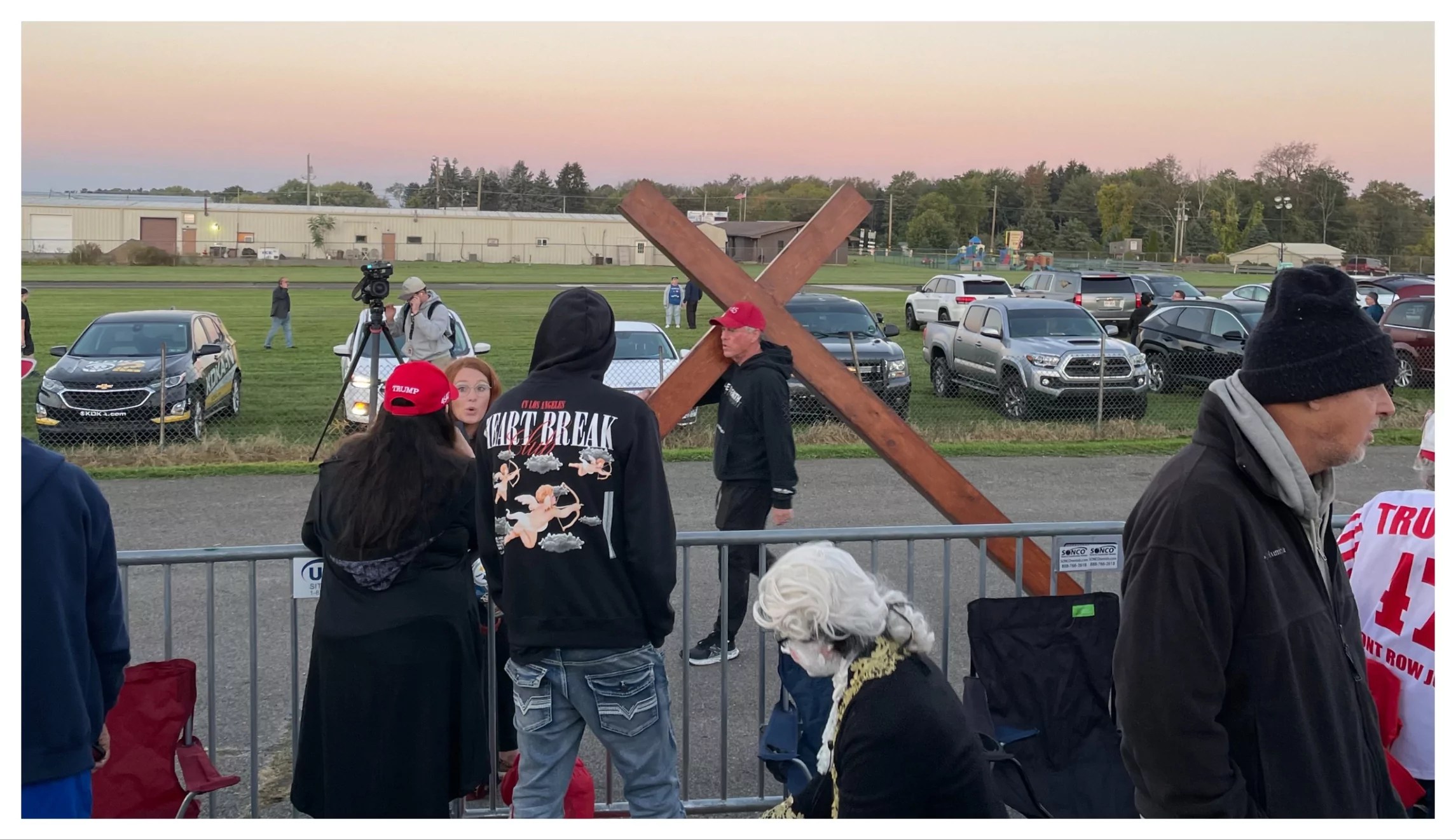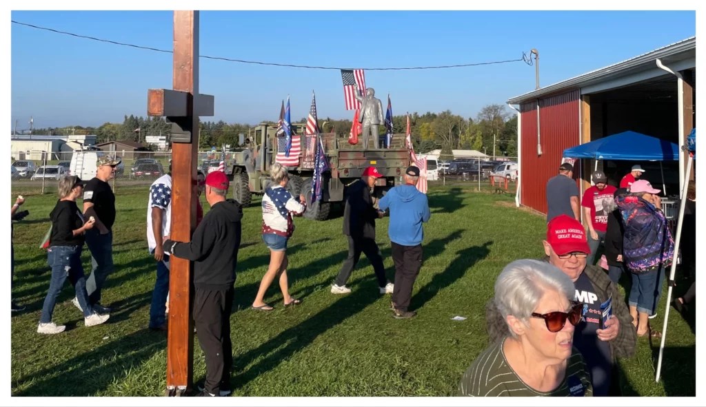 Beazley later set up the cross at the entrance of the lines to get into the rally, near a statue of Trump pumping his fist.