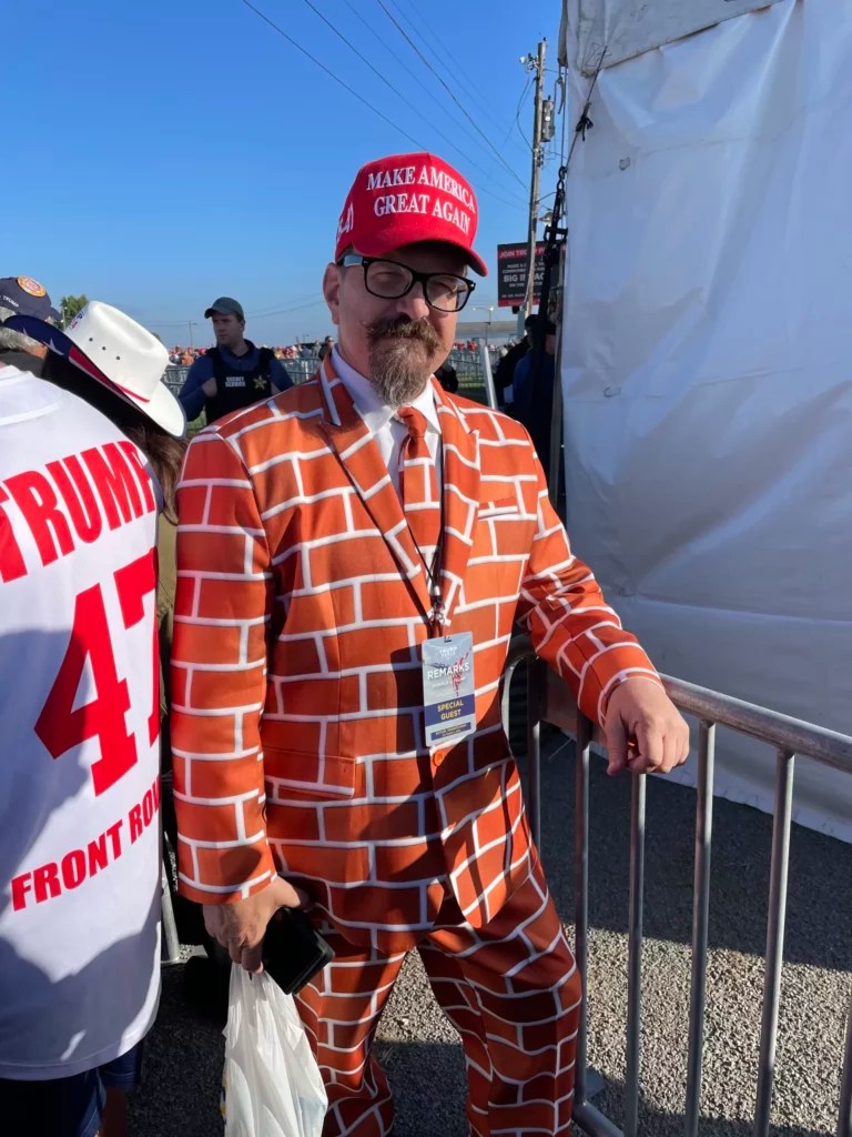Marnell, distinguished by his signature brick suit, has attended over 100 rallies, by Trump’s estimation. The former president frequently calls him out.
