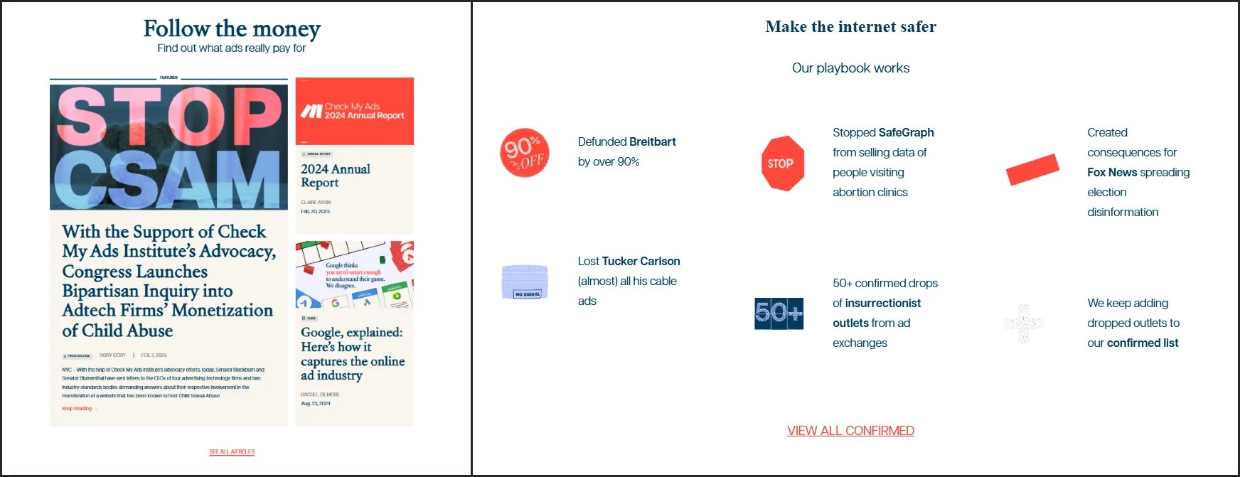 Check My Ads Institute is an activist organization founded in 2022 to stop advertising dollars from supporting what it deems to be disinformation or hate speech. An archived version of the group’s website from just after Election Day included a section titled “Our playbook works.” Underneath the heading, Check My Ads bragged about allegedly cutting advertising funding to Breitbart News by 90%, taking away “(almost) all” of Tucker Carlson’s cable ad revenue, creating “consequences for Fox News spreading election disinformation,” and getting advertisers to drop over 50 “insurrectionist outlets.”