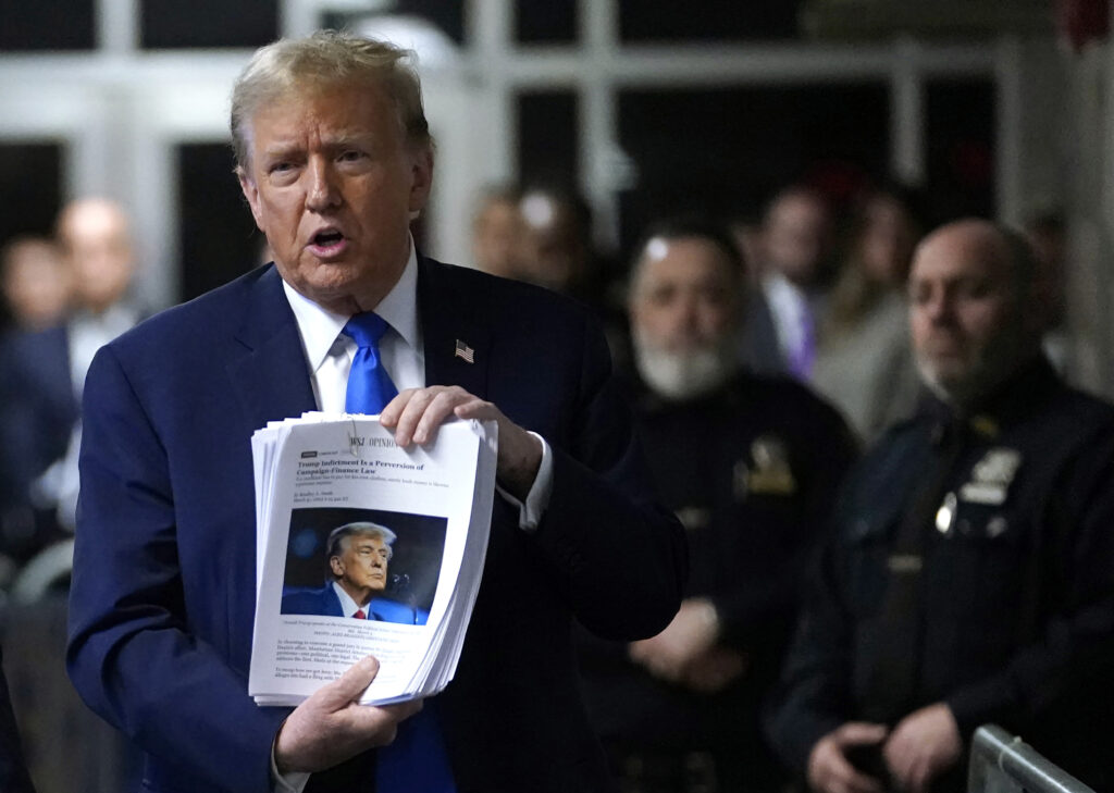 Outside the courtroom, Trump carried a stack of newspaper editorials and articles that he said took aim at the strength of the case against him, saying, “It really is a very unfair trial.”