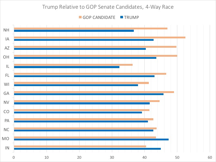 A comparison of how Republican Senate hopefuls are faring compared to the presidential nominee in crucial battlegrounds tells much of the story. In 12 of 14 showdowns for the upper chamber that Real Clear Politics identifies as “key” contests, the down-ballot GOP candidate is outperforming Trump in the polls. This accounts for Trump’s numbers in both two- and four-way fields in the run for the White House. (In only a couple of instances does the difference between the margins in the two- and four-way comparisons exceed two percentage points.)