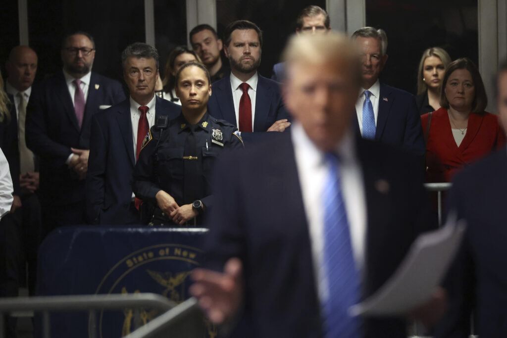 Sens. J.D. Vance (R-OH) and Tommy Tuberville (R-AL) appeared behind former President Donald Trump at his New York hush money trial.
