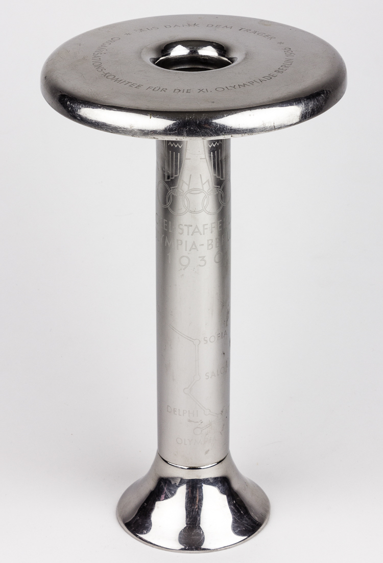 Alexander Historical Auctions of Chesapeake City, Md., said the 10-and-a-half-inch steel torch was a gift to the runner from the German Olympic Committee. 1936 was the first time the flame exchange was run from Greece to the site of the games.