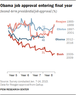 As he enters his last year in office, Obama also has middling approval ratings. At a steady 46 percent approval and 48 percent disapproval, he is behind former Presidents Clinton and Reagan at this stage, but well ahead of former President George W. Bush.