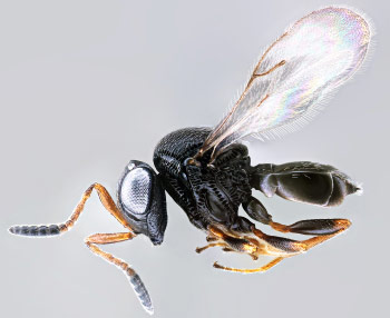 The samurai wasp (Trissolcus japonicus) is a natural enemy of the brown marmorated stink bug. Photo by E. Talamas/StopBMSB.org