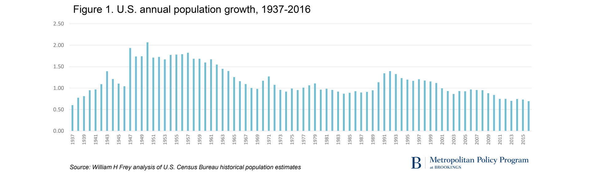“It is likely that some of the reduced fertility in recent years is attributable to recession-related delays in family formation among young adult millennials; this trend could reverse in the near future as the economy continues to grow. But higher death rates are likely to continue due to the long-term aging of the population, a phenomenon contributing to projected declines in U.S. growth rates, which could drop as low as 0.5 percent in 2040,” said the analysis from William H. Frey, a Brookings senior fellow.