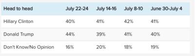 CBS showed a two point rise for Trump, who leads 42 percent to 40 percent. CBS said that Clinton closed that gap to 1 point after selecting Virginia Sen. Tim Kaine as her running mate.