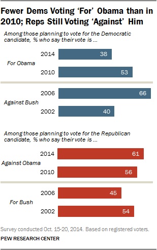 “Currently, 32 percent of registered voters say they think of their vote for Congress as a vote against Obama, while 20 percent see it as a vote for Obama; 45 percent of voters say Obama will not be a factor in their decision. Just 38 percent of Democratic voters think of their vote as for Obama, down from 53 percent four years ago,” added Pew.