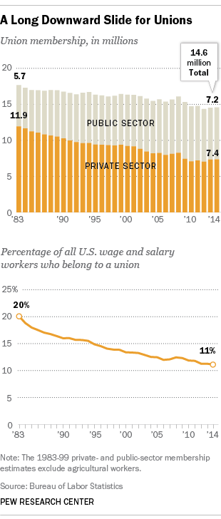 In a report out Monday, Pew found that 11 percent of the workforce belongs to a union, down from 20 percent in 1983. In numbers, there are 14.6 million union members compared to 17.6 million in 1983.