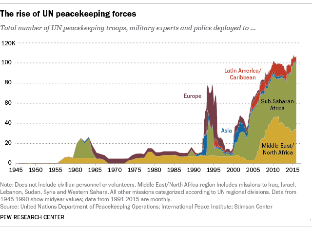“Today, a record low share of U.N. peacekeepers are from the U.S., just 76 personnel, or 0.07 percent,” said Pew.