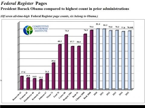 “President Obama has no peer in Federal Register bloat, today setting records compared to both himself and all past presidents. Of the seven highest-ever annual page counts since the Federal Register first began in 1936, six of them belong to Obama as of today,” Crews said in a report headlined, “Obama Cements Status as King of Regulatory Bloat.”