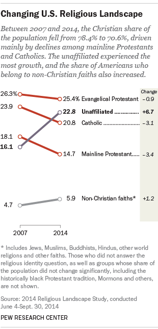 — The share of Americans “unaffiliated” with any church is soaring, up 6.7 percent to 23 million.