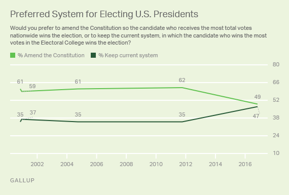 Gallup reported that support for the Electoral College jumped from 35 percent to 47 percent. And opposition declined from 62 percent to 49 percent.