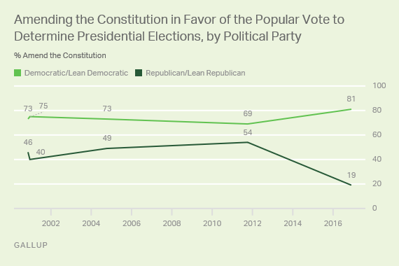 Gallup said, “Currently, 19 percent of Republicans and Republican-leaning independents favor basing the winner on the popular vote, down from 49 percent in October 2004 and 54 percent in 2011. Democrats and Democratic-leaning independents already widely favored having the popular vote determine the winner and are slightly more likely to do so now than in the past.”