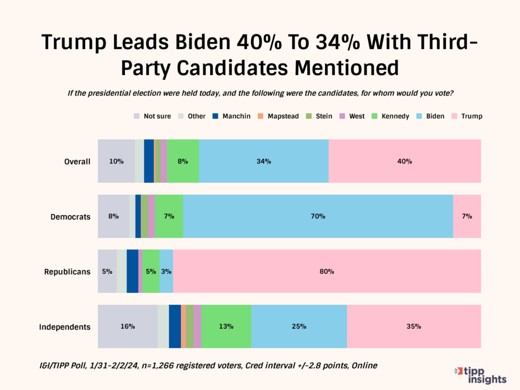 Here, the potential outcome of the race becomes more clear. When third-party candidates such as Kennedy are included in a poll of all voters, Trump’s lead widens to 40% to Biden’s 34%, outside the margin of error.