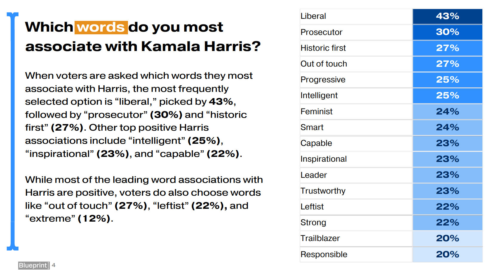 The Democratic pollster’s new survey on Harris shows that there are just a few things voters firmly know about the vice president. First is her liberal politics. When asked to cite a word they associate Harris with, “liberal” was top at 43%.