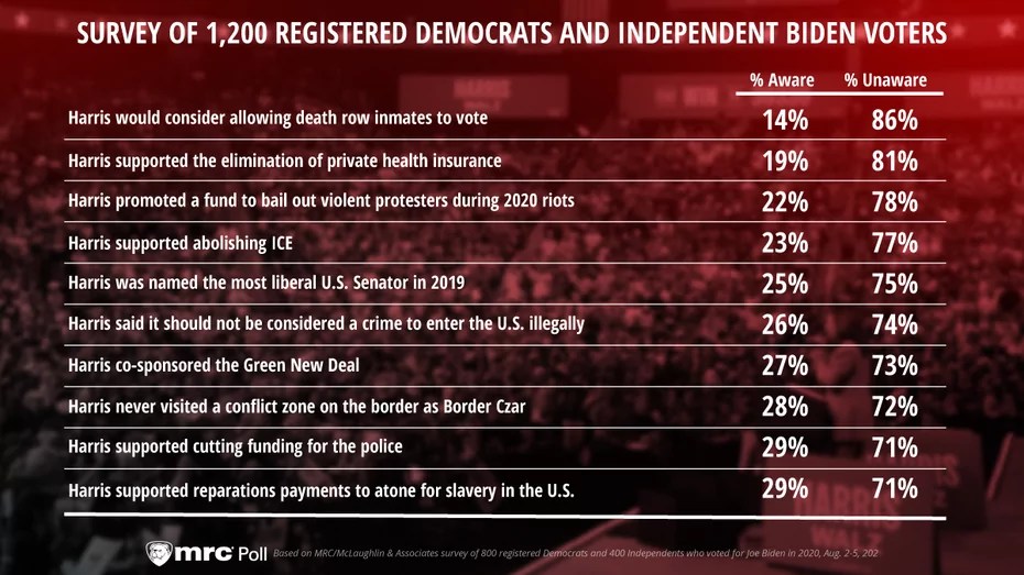 While the survey was done for MRC, a Harris critic, and conducted by McLaughlin & Associates, which has advised the campaign of former President Donald Trump, the lack of knowledge by her supporters of her positions is stunning.
