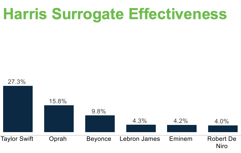 “By a more than 2:1 margin, voters believe Elon Musk (47%) was the most effective surrogate for Trump, followed by Joe Rogan and RFK Jr. tied at 22%. Harris’s surrogates were substantially less effective, with only Taylor Swift breaking 20% followed by Oprah at 16%,” the pollster said.