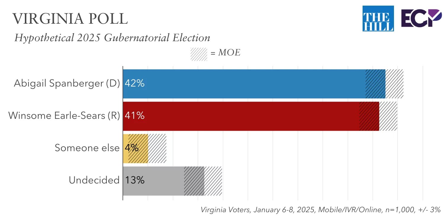 The latest Emerson College Polling/the Hill results just released have Democrat Abigail Spanberger edging Lt. Gov. Winsome Earle-Sears 42% to 41%. The margin of error is plus or minus three points.