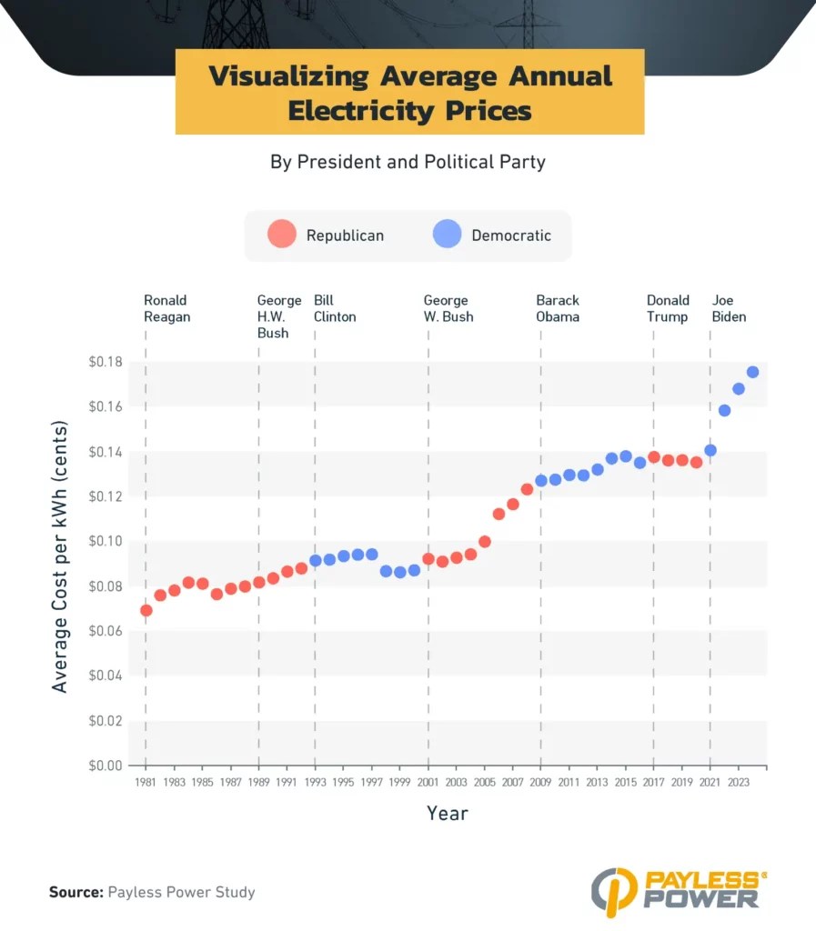 The Payless Power survey of prices under presidents since Jimmy Carter showed a price of 16 cents per kilowatt-hour during Biden’s term, a 24% jump over the first Trump administration when it was 13 cents.