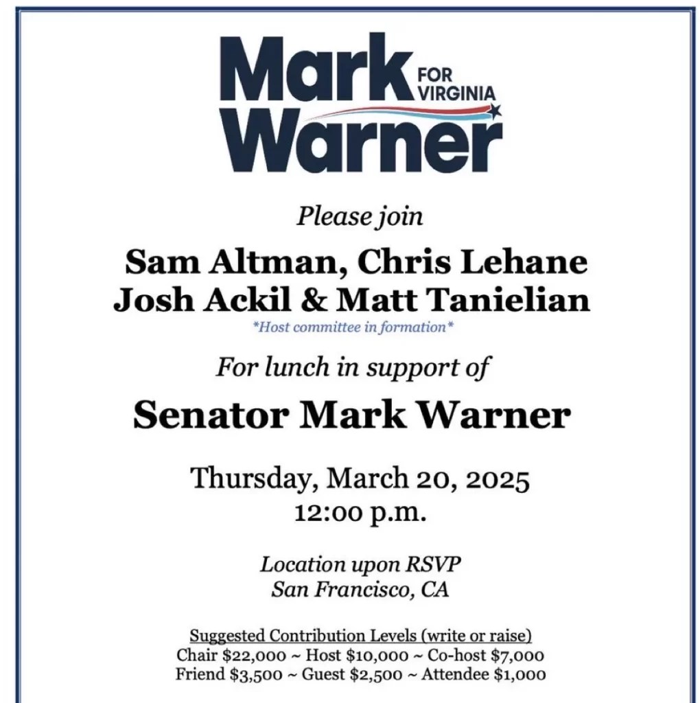 The reason: Altman is hosting a top-dollar fundraiser for Trump critic Sen. Mark Warner (D-VA) in 10 days. The San Francisco event is collecting donations from $1,000 to $22,000.