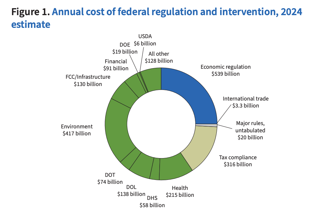 “Off-budget or not, these regulatory costs drag down the economy, much as overspending can. Just as consumers shoulder much of the corporate income tax and tariff burden, regulatory compliance costs and mandates borne by businesses percolate through the economy and materialize as higher prices, lost jobs, and lower output,” the new report said.